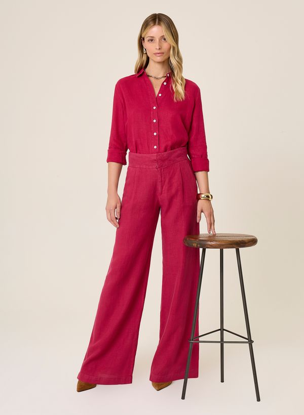 Reta, proporcionando caimento sofisticado e atemporal, cós mais largo, bolsos faca, fechamento frontal por zíper e colchete interno, acabamento pespontado.