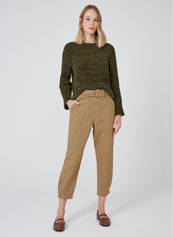 Confeccionada em sarja e em modelo cargo, a Calça possui cintura alta, cós com passantes e cinto de tecido, 2 bolsos frontais, 2 bolsos traseiros e acabamento pespontado.