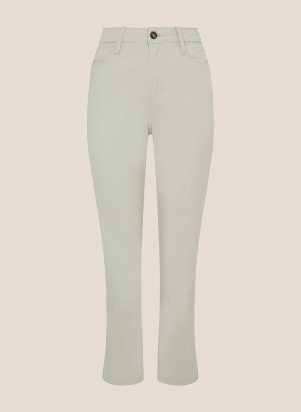 Confeccionada em sarja, a Calça possui modelagem reta, cós com passantes, bolsos frontais e posteriores, fechamento frontal por zíper e botão e acabamento pespontado.