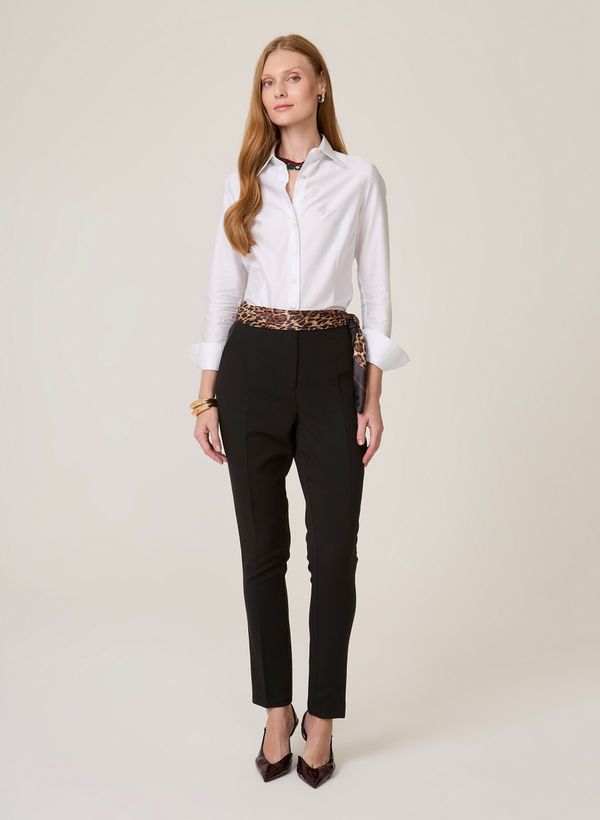 Alfaiataria, cós alfaiatado com elástico para melhor vestir, barra reta levemente ajustada e fechamento frontal.