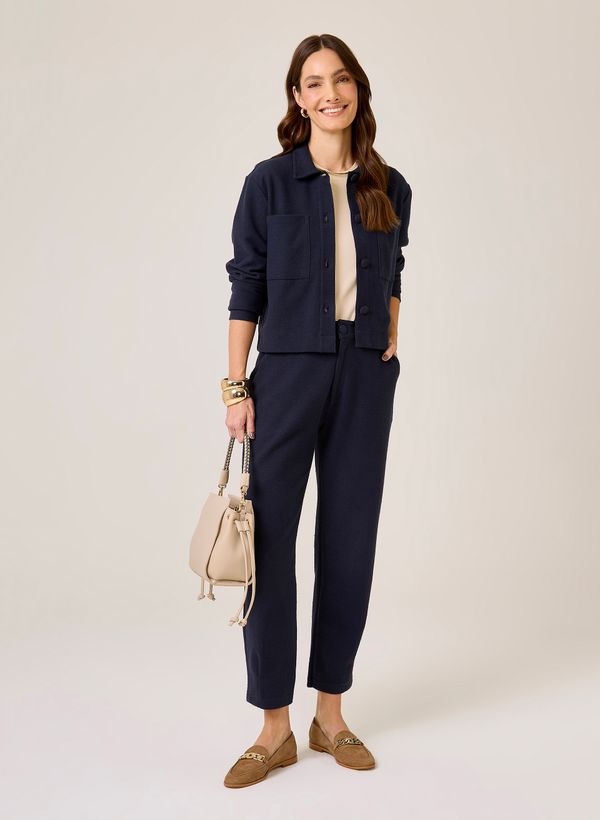 Straight, cós alfaiatado, bolsos laterais, fechamento frontal e acabamento pespontado.