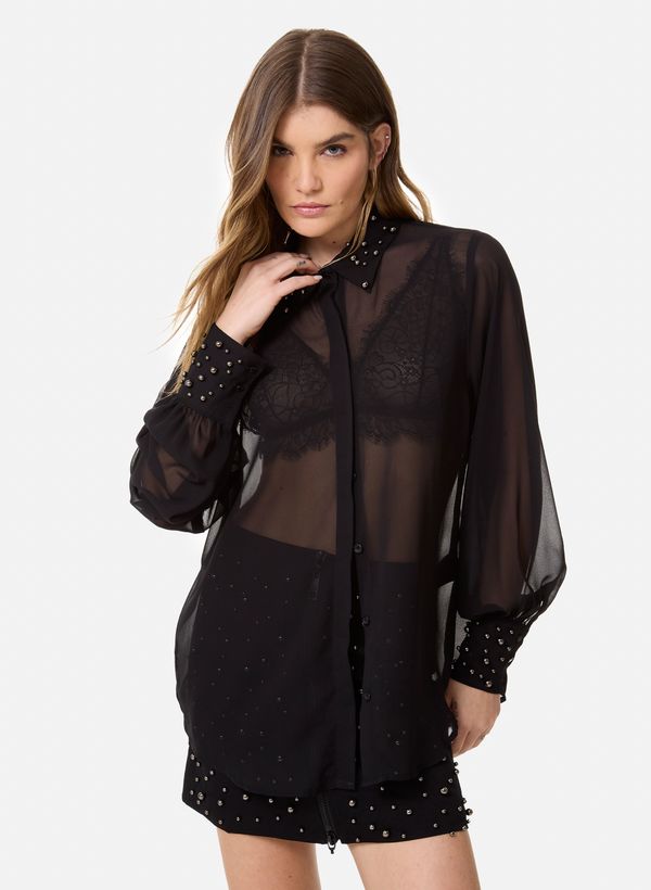 Confeccionada em tecido plano com leve transparência, a Camisa possui modelagem ampla, mangas longas, gola, detalhe de aplicação de rebites, fechamento frontal por botões e acabamento pespontado. Não possui forro.