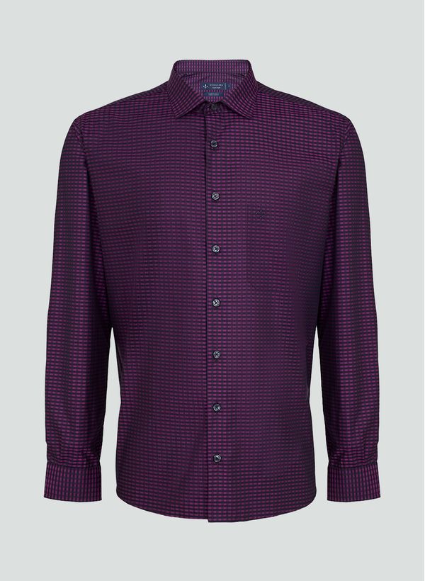 A Camisa é confeccionada em tecido plano, possui modelagem comfort, gola com colarinho, mangas longas com abotoamento nos punhos, fechamento frontal por botões e acabamento pespontado.