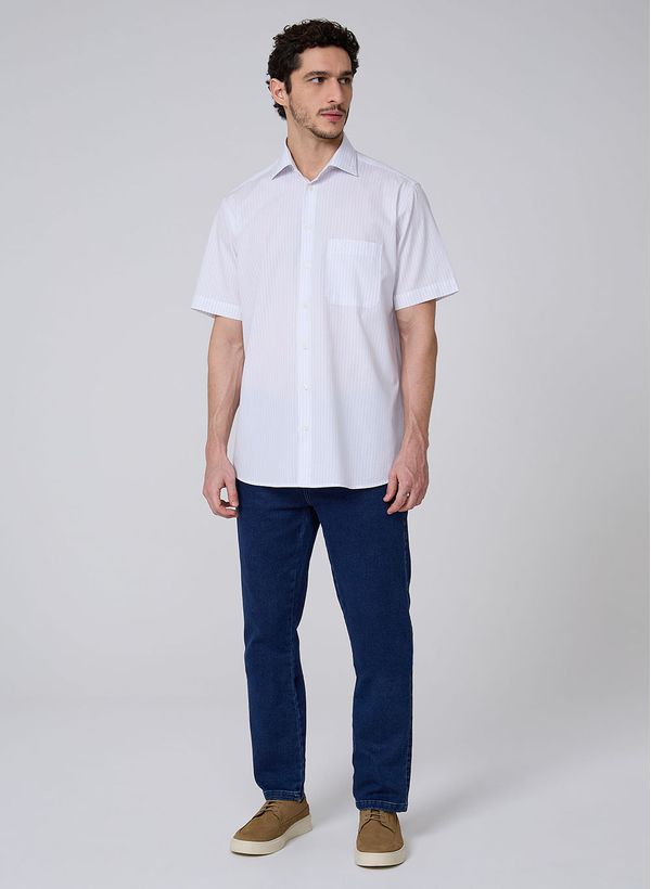 Confeccionada em tecido plano, a Camisa possui modelagem comfort fit, padronagem listrado, colarinho Firenze, detalhe de logo bordado na parte frontal, mangas curtas, bolso chanfrado e fechamento frontal por botões.