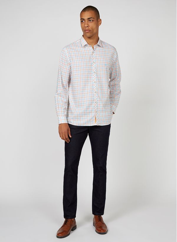 A Camisa é confeccionada em tecido plano com padronagem xadrez, possui modelagem comfort fit com caimento solto, colarinho slim, mangas longas com abotoamento triplo nos punhos, fechamento frontal por botões, detalhe frontal de logo bordada e acabamento pespontado.