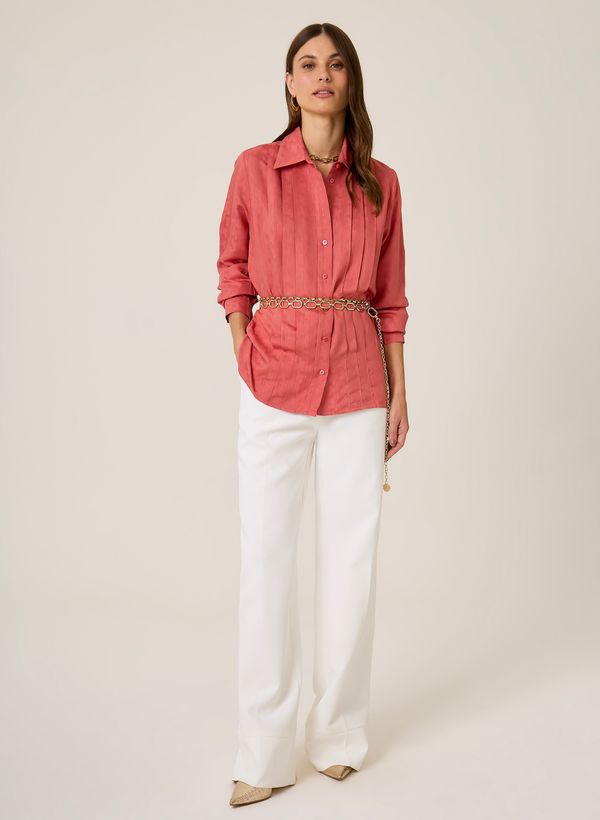 Confeccionada em tecido fluido, a Camisa possui padronagem estampada, pregas frontais, colarinho tradicional, mangas longas, fechamento frontal por botões e detalhe de logo em metal na parte posterior.