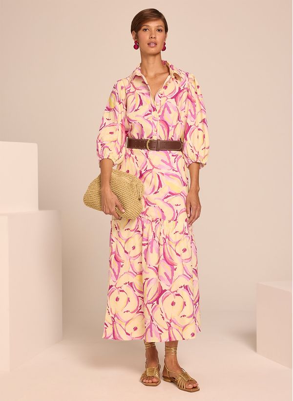 A Camisa é confeccionada em tecido plano com toque de linho, possui estampa, caimento reto, gola com colarinho, mangas 3/4 bufantes, fechamento frontal por botões e acabamento pespontado.