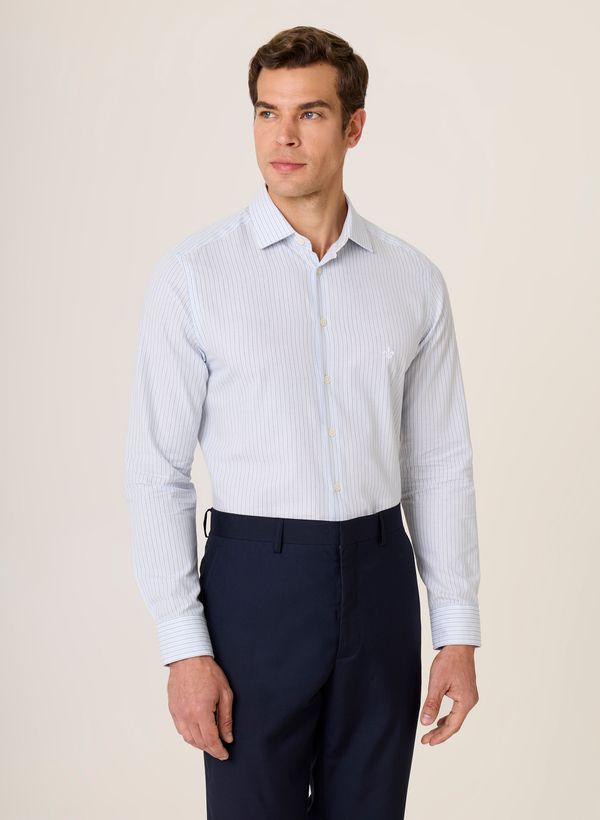Confeccionado em tecido plano, a Camisa possui modelagem Milano Fit, mangas longas, colarinho Firenze Slim, detalhe bordado com logo no peito, padronagem Listrada, fechamento por botões e acabamento pespontado.