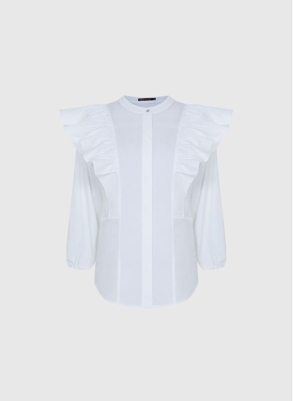 Confeccionada em tecido plano, a Camisa possui colarinho padre, fechamento frontal por botões, babados estruturados nas laterais, mangas 3/4 bufantes, barra curvada e acabamento pespontado.