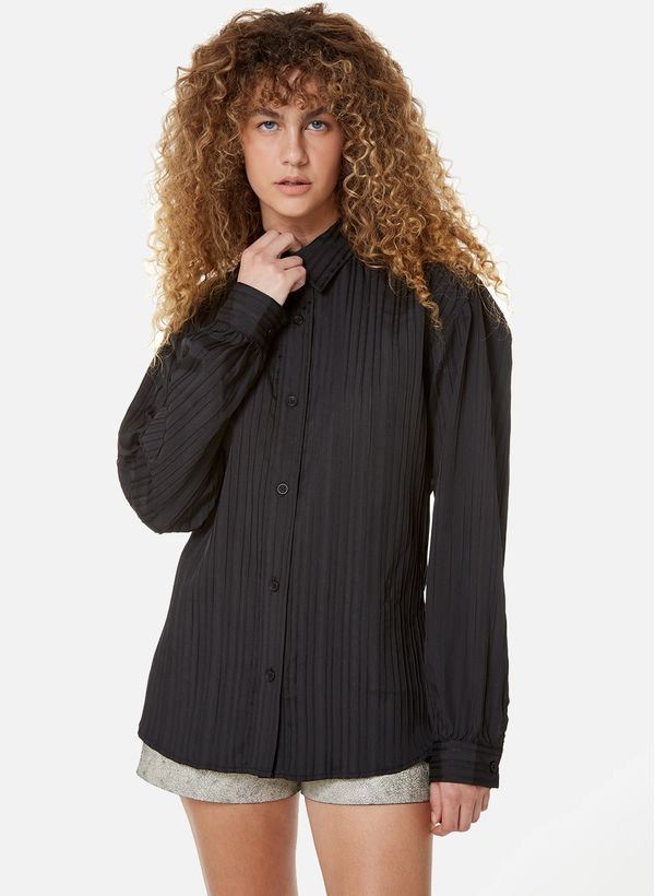 Confeccionada em tecido plano plissado, a Camisa possui modelagem mais ampla ao corpo, corte oversized, comprimento alongado, fechamento por botões personalizados metálicos e acabamento pespontado.