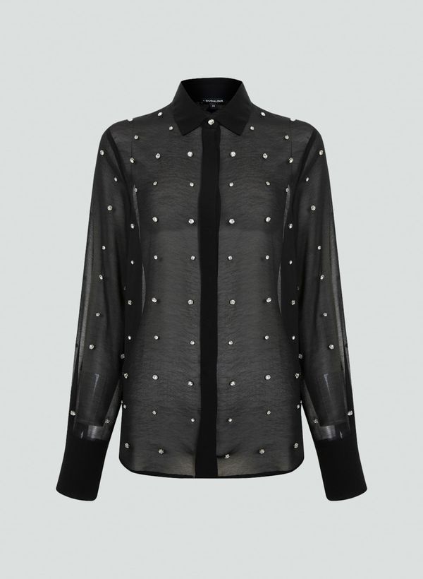 Confeccionada em tecido fluido, a Camisa possui modelagem Regular Fit com aplicação de cristais, colarinho, mangas longas, e fechamento frontal por botões.