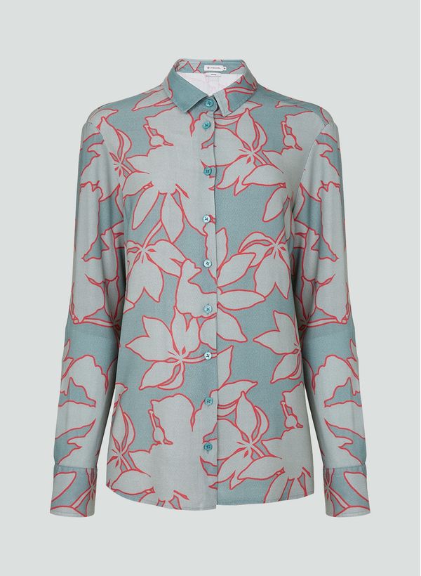 A Camisa é confeccionada em tecido fluido com padronagem, possui modelagem Relaxed, colarinho Slim, mangas longas, punho com duplo chanfro e logo em metal aplicada na parte posterior.