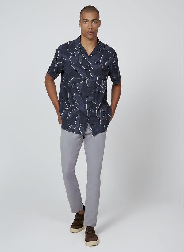 A Camisa é confeccionada em tecido estampado floral, possui modelagem resort, mangas curtas, fechamento frontal por botões, gola clássica e acabamento em pespontos.