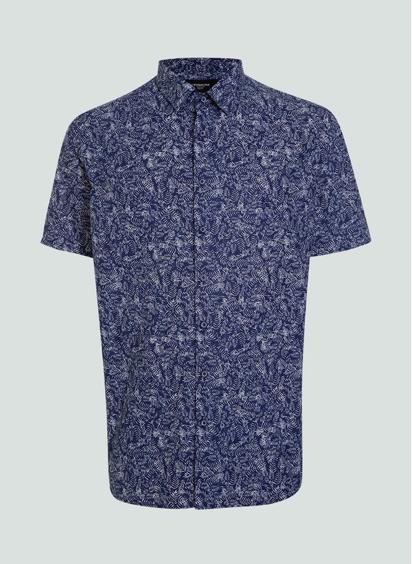 Confeccionada em tecido plano, a camisa possui modelagem slim, padronagem estampada, colarinho slim, detalhe de logo bordado na parte frontal, mangas curtas e fechamento frontal por botões.