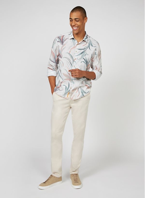 A Camisa é confeccionada em tecido plano de algodão estampado, possui modelagem slim fit, mangas longas com abotoamento nos punhos, fechamento frontal por botões, detalhe frontal de logo bordada, barra arredondada e acabamento pespontado.