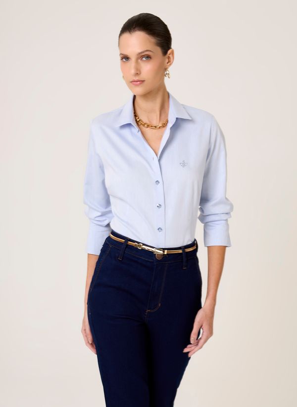 Confeccionada em tecido plano, a Camisa possui modelagem Slim Fit, colarinho Slim, mangas longas, punho diferenciado com abotoamento, aplicação de cristal no peito formando o logo “Flor de Lis”, vista frontal por fechamento frontal por botões em formato de flor e acabamento pespontado.
