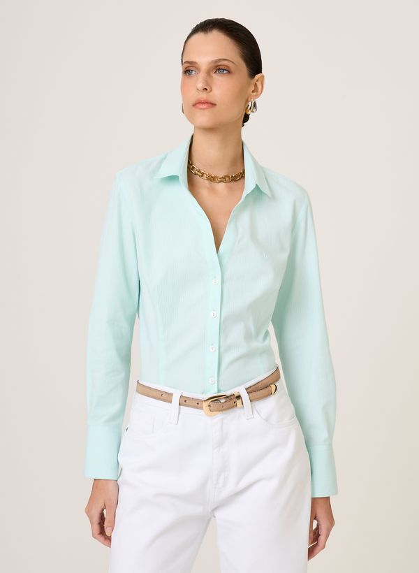 Confeccionada em tecido plano, a Camisa possui modelagem Slim Fit, colarinho Slim, mangas longas, punho clássico com abotoamento, detalhe logo bordado no peito, vista frontal por fechamento em botões e acabamento pespontado.
