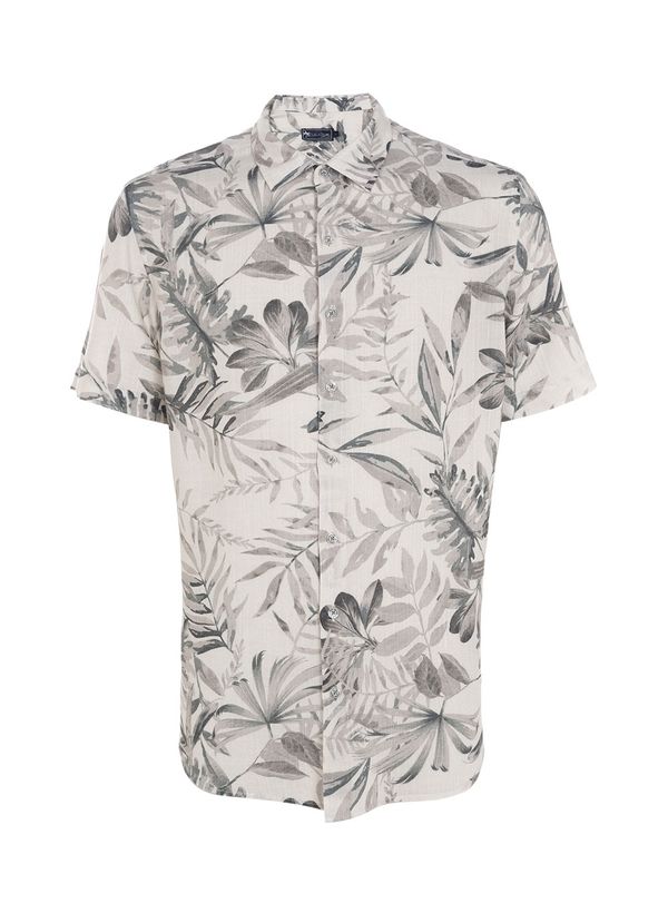 A Camisa é confeccionada em tecido plano e fluído, possui padronagem estampada, modelagem slim fit, mangas curtas, fechamento frontal por botões, detalhe frontal de logo bordada, barra arredondada e acabamento pespontado.