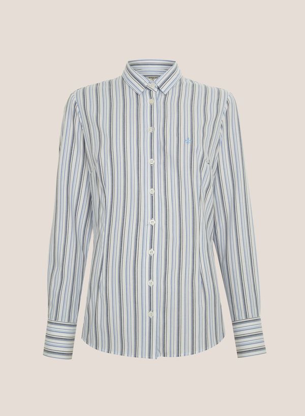 Confeccionada em tecido plano, a Camisa possui modelagem Slim Fit, colarinho Slim, mangas longas, punho chanfrado com abotoamento, detalhe logo bordado, padronagem Listrada com abotoamente e fechamento frontal por botões.