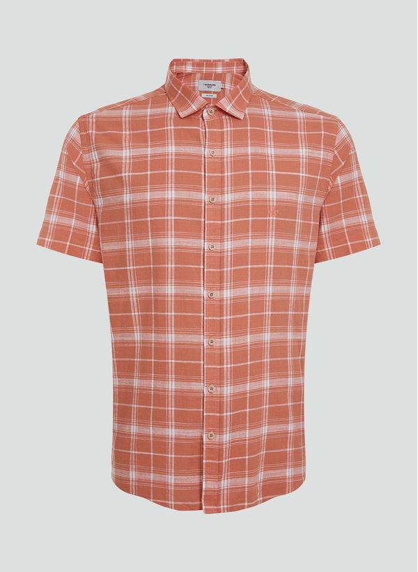 Confeccionada em tecido plano, a camisa possui modelagem slim, padronagem xadrez, colarinho firenze slim, detalhe de logo bordado na parte frontal, mangas curtas e fechamento frontal por botões.