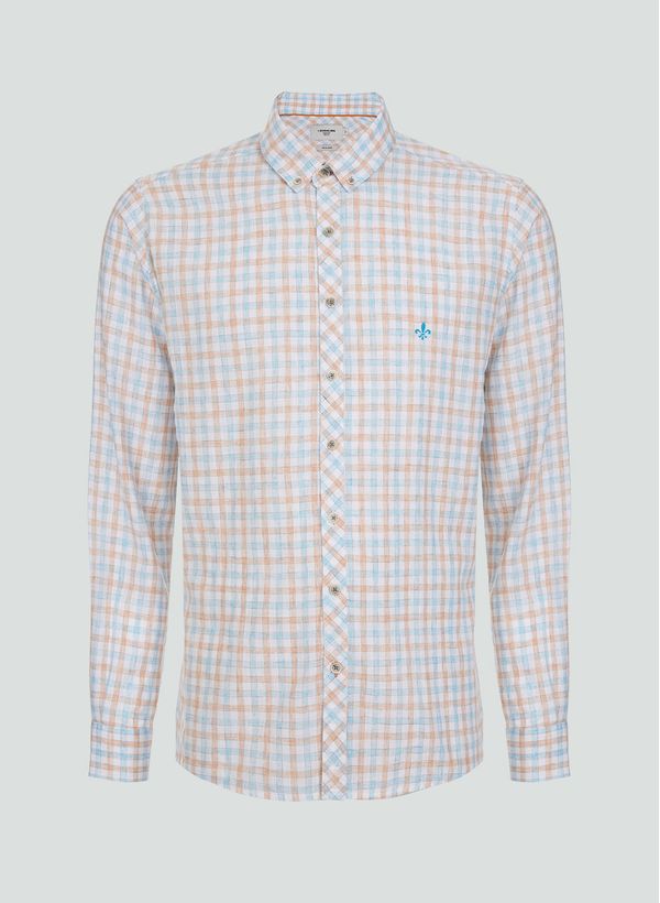 Confeccionada em tecido plano, a camisa possui modelagem slim, padronagem xadrez, colarinho button down, detalhe de logo bordado na parte frontal, mangas longas, punhos chanfrados e fechamento frontal por botões.
