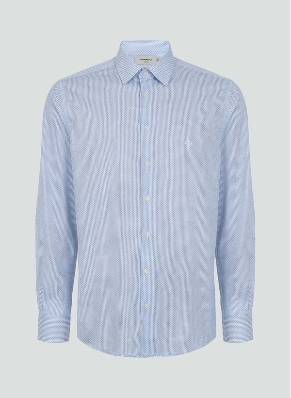Confeccionada em tecido plano, a camisa possui modelagem slim, mini print, colarinho slim, detalhe de logo bordado na parte frontal, mangas longas, punhos redondos e fechamento frontal por botões.