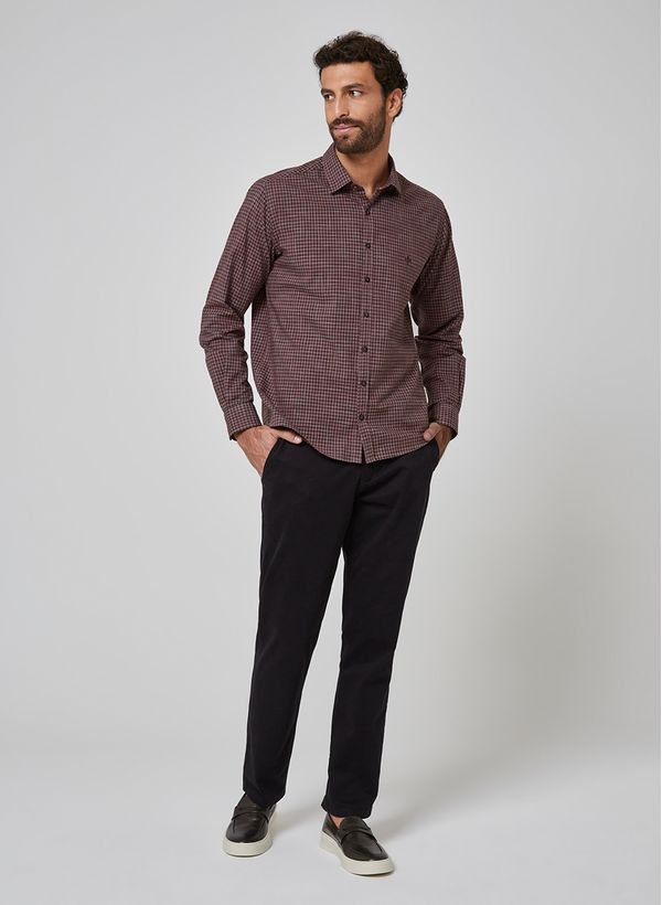 Confeccionada em tecido plano, a camisa possui modelagem slim, padronagem xadrez, colarinho slim, detalhe de logo bordado na parte frontal, mangas longas, punhos redondos com abotoamento e fechamento frontal por botões.