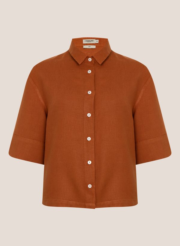Confeccionada em linho, a Camisa possui modelagem Special Fit, comprimento Cropped colarinho Slim, mangas curtas com barra larga, detalhe logo em metal nas costas, vista frontal por fechamento em botões e acabamento pespontado.