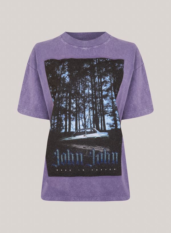 Confeccionada em malha, a Camiseta possui modelagem ampla, gola redonda canelada, estampa frontal com técnica de bright caviar aplicados, mangas curtas e acabamento pespontado.