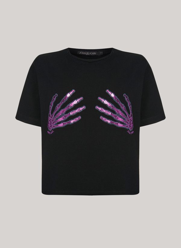Confeccionada em malha, a Camiseta possui modelagem Babylook, justa ao corpo, mangas curtas, gola careca, estampa frontal em alto relevo com foil grafite e pink e acabamento pespontado.