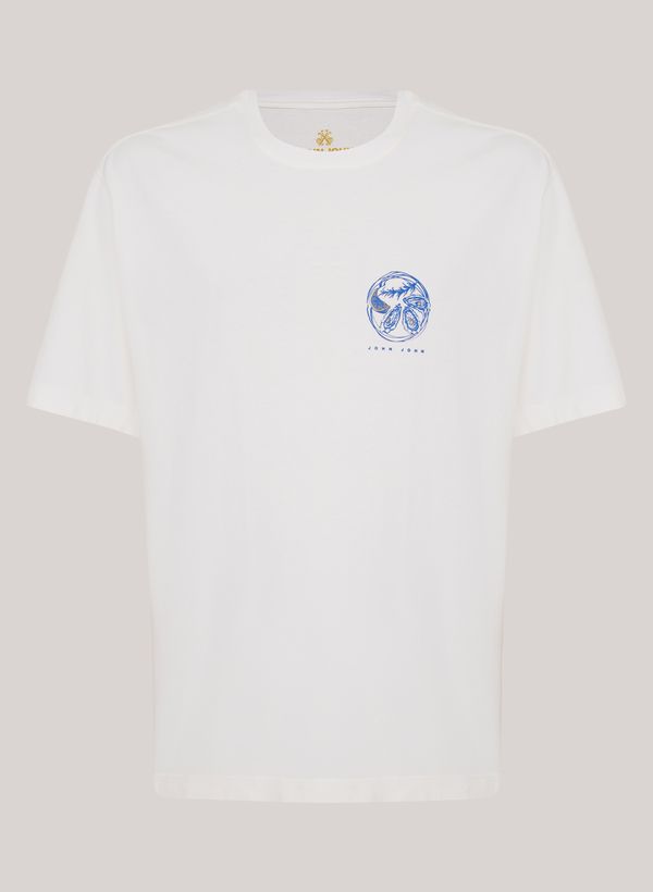 Confeccionada em malha, a Camiseta possui modelagem box, gola careca, estampa frontal localizada, estampa posterior em silk e técnica de flocagem, mangas curtas e acabamento pespontado.