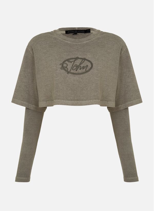 Confeccionada em malha com lavanderia estonada, a Camiseta possui modelagem cropped, gola careca, estampa frontal com aplicação de hot fix, mangas curtas com mangas longas embutidas e acabamento pespontado.