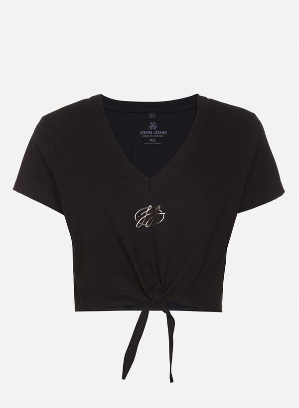 Confeccionada em malha, a Camiseta possui modelagem cropped, decote em "V", assinatura da marca em foil metalizado, detalhe de "nó" frontal, mangas curtas e acabamento pespontado.