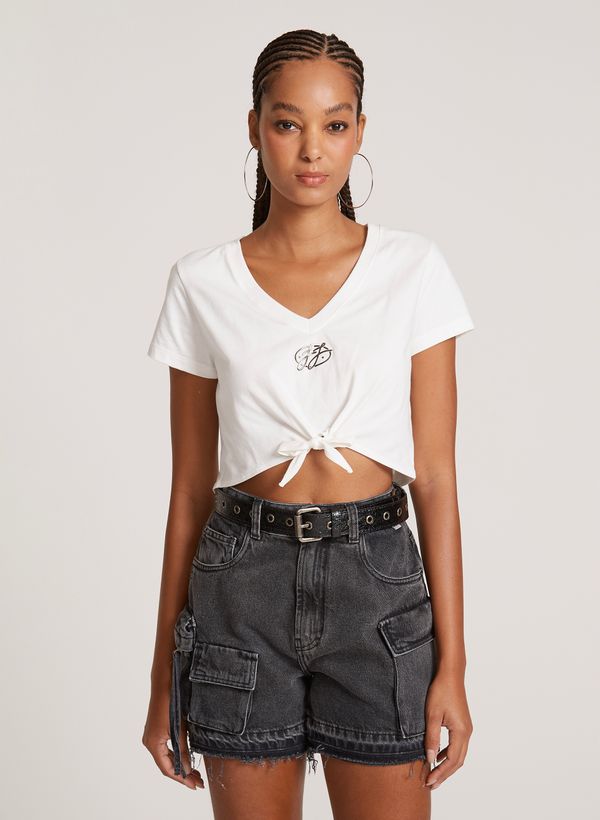 cropped, gola em "V", mangas curtas, estampa frontal, recorte com amarração e acabamento pespontado.