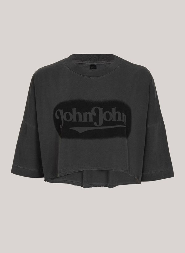 Confeccionada em malha com lavagem estonada, a Camiseta possui modelagem cropped, gola careca, estampa frontal, mangas curtas, barra cortada a fio e acabamento pespontado.