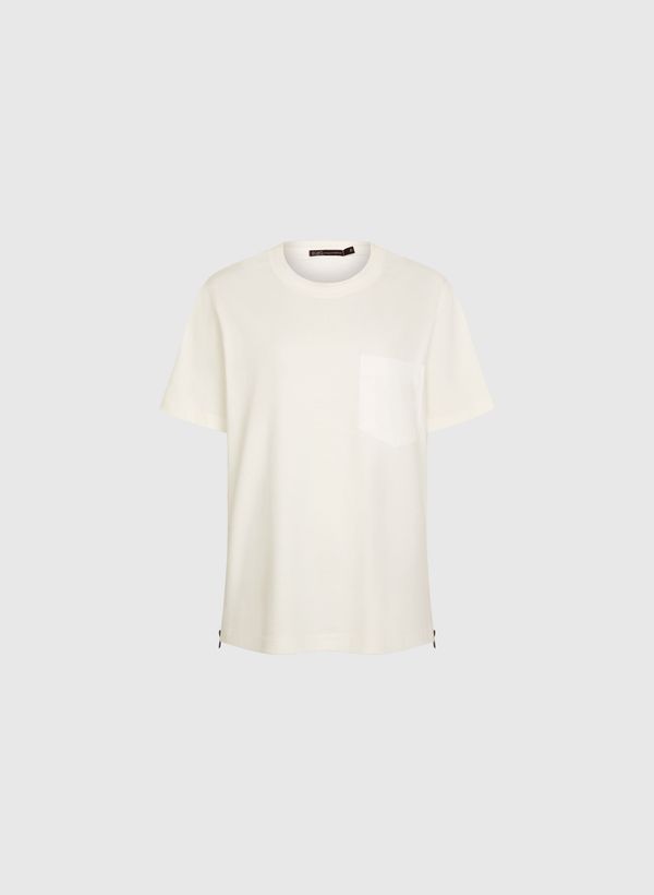 A Camiseta é confeccionada em malha, possui caimento reto, gola redonda, mangas curtas, bolso frontal, fechamento lateral com zíper e acabamento pespontado.