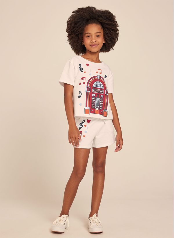 A Camiseta é confeccionada em malha, possui estampa frontal localizada, decote redondo, mangas curtas e acabamento pespontado.