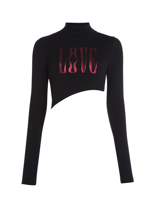 Confeccionada em malha, a Camiseta possui modelagem cropped assimétrica, justa ao corpo, mangas longas, gola alta, estampa frontal em foil e acabamento pespontado.