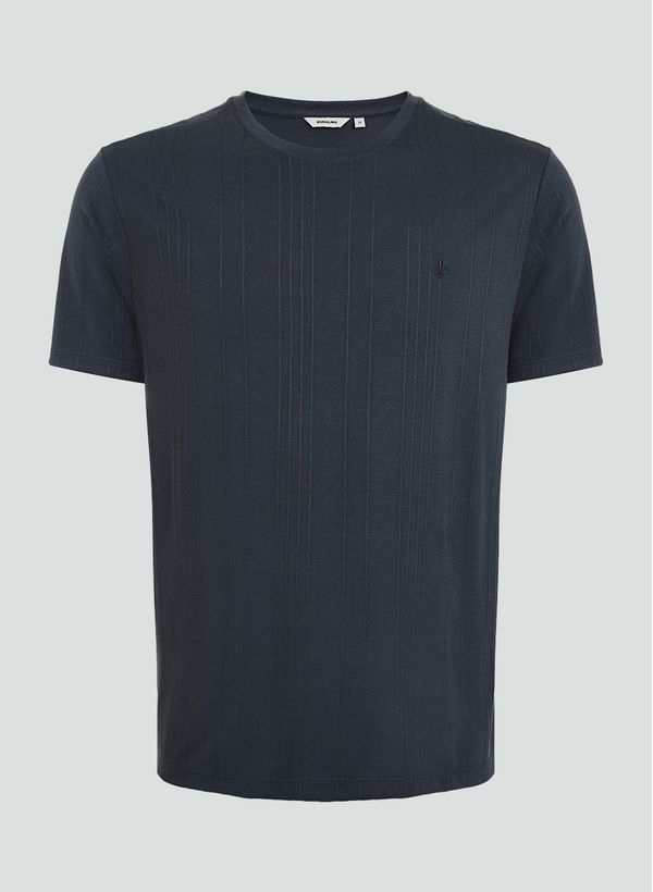 Confeccionado em malha, a Camiseta possui modelagem reta, gola arredondada com acabamento canelado, mangas curtas, superfície com padronagem Maquinetada em listras verticais por toda a peça, bordado frontal da marca na altura do peito e barra com acabamento pespontado.