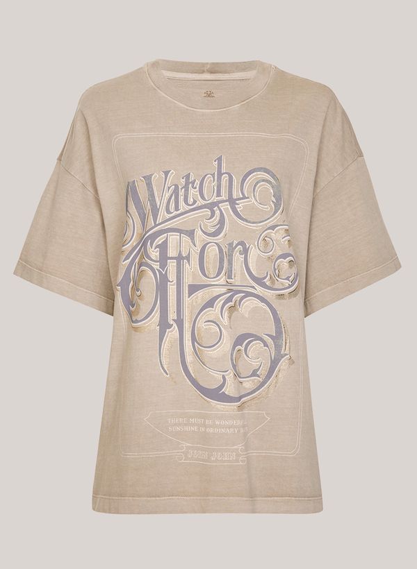 oversized, gola careca, mangas curtas, estampa frontal e acabamento pespontado.