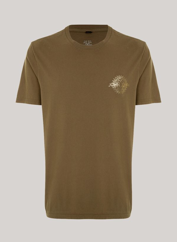 Confeccionada em malha, a Camiseta possui modelagem slim Fit, gola careca, estampa frontal e posterior em foil metalizado, mangas curtas e acabamento pespontado.