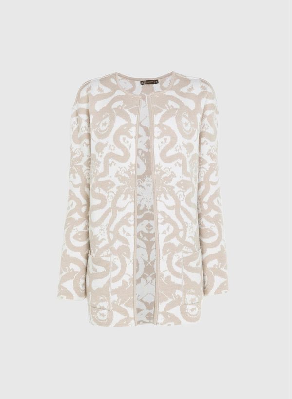 Confeccionado em tricot com estampa em jacquard, o Casaco possui caimento reto, mangas longas, bolsos frontais amplos, comprimento alongado, estampa cobra e aplicação de tag metalizada posterior.