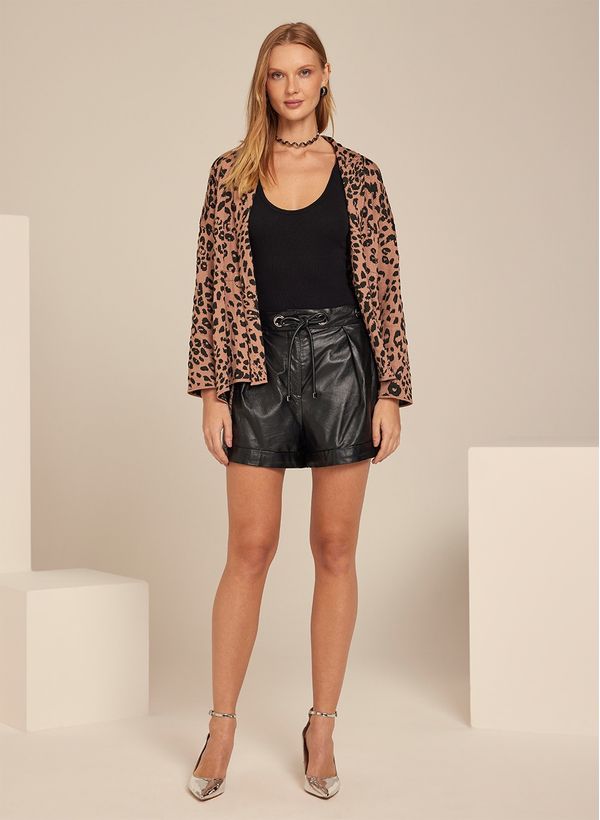 O Casaco é confeccionado em tricot, possui padronagem animal print, mangas longas, comprimento curto e acabamento canelado. Não há fechamento.