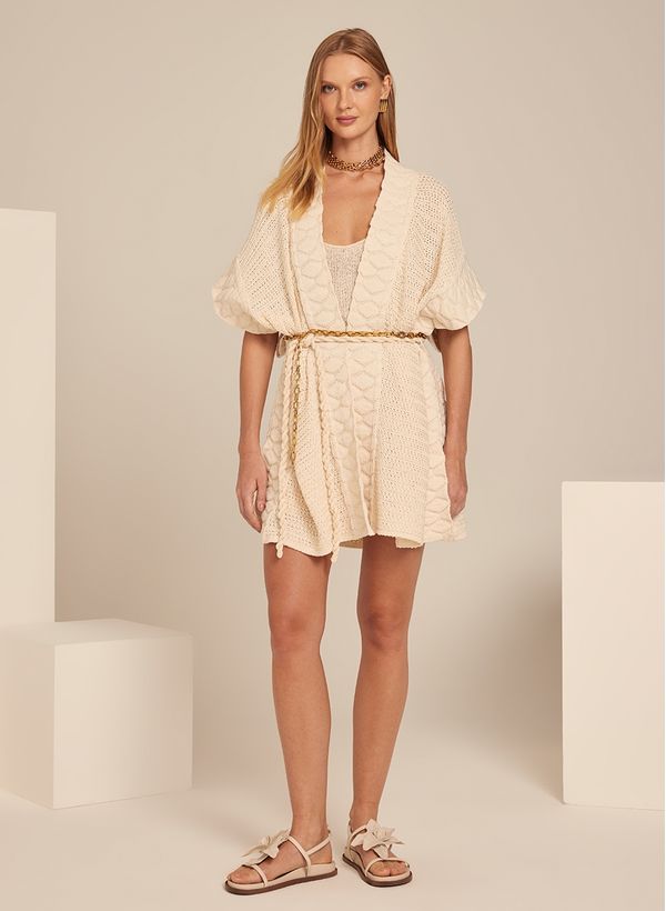 O Casaco é confeccionado em tricot, possui modelo kimono, caimento reto, mangas curtas amplas, comprimento alongado e acabamento canelado. Não há fechamento.