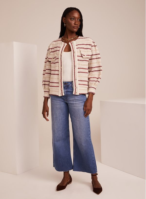 O Casaco é confeccionado em tricot, possui gola redonda, fechamento frontal por botões, dois bolsos frontais, mangas longas levemente bufantes e acabamento canelado.