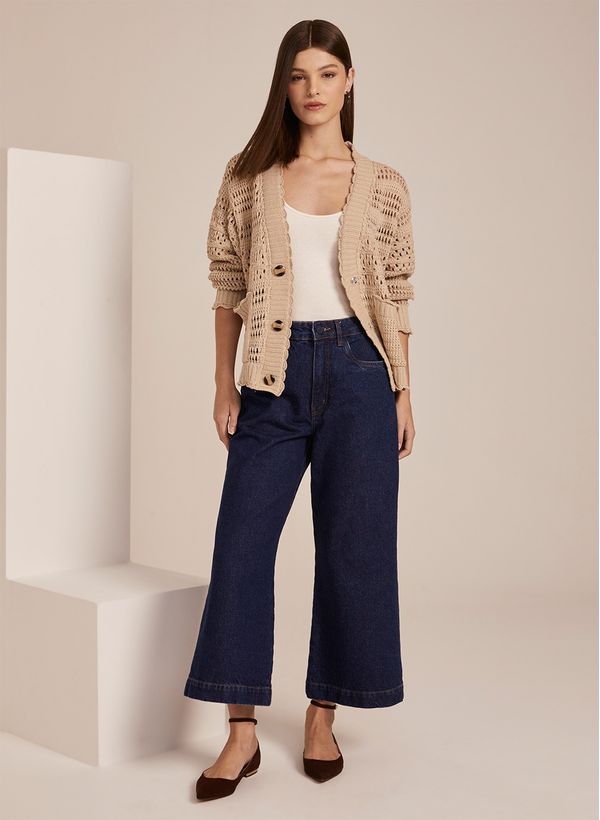 O Casaco é confeccionado em tricot comdetalhes vazados,possui transparência,mangas longas,decote em "V", fechamento frontal por botões, doisbolsos frontaise acabamento canelado.