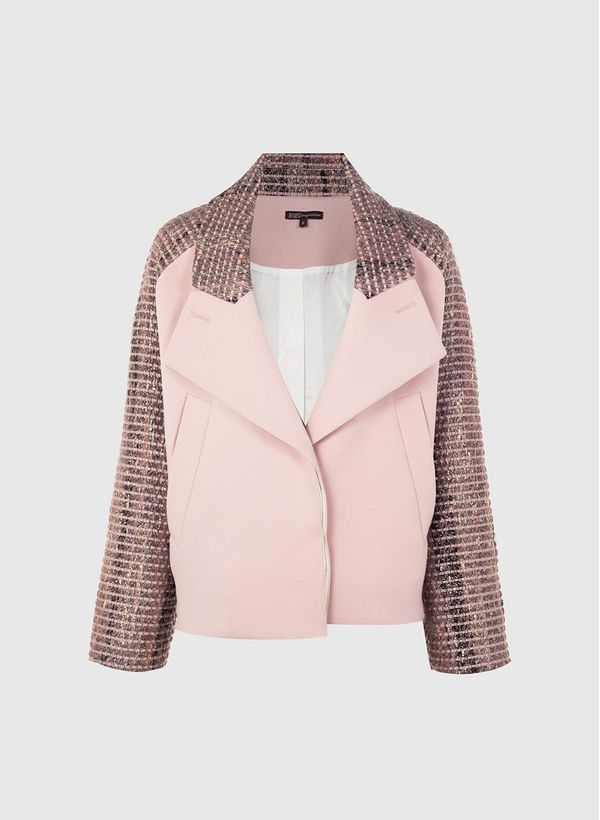 Confeccionado em tecido plano com tweed e fios metálicos, o Casaco possui modelagem alfaiataria, colarinho, lapelas peaked, mangas longas, fechamento frontal por botões, dois bolsos e barra com elástico aplicado posterior.