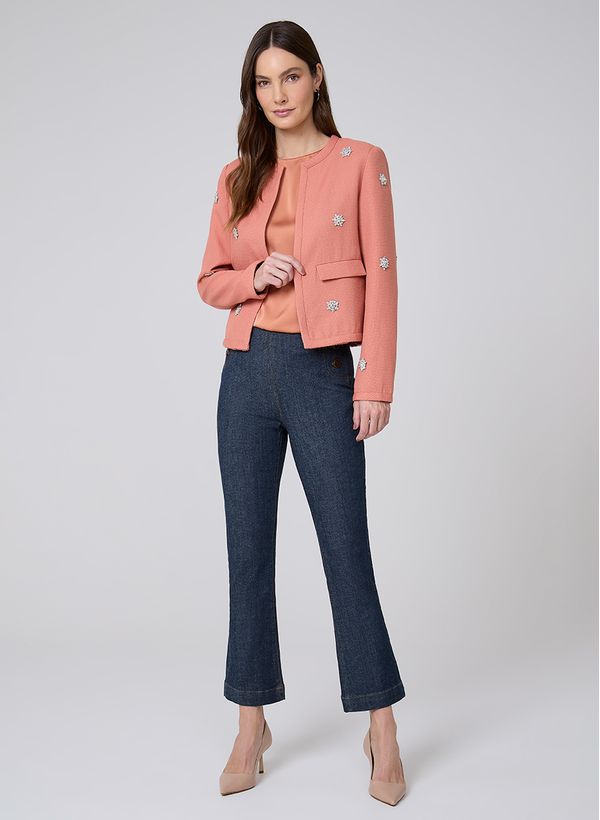 Confeccionado em tecido plano, o Casaco possui modelagem alfaiataria, bolsos frontais com lapela e cristais aplicados.