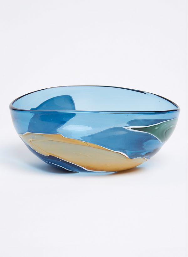 O Centro de Mesa Liquid possui formato arredondado irregular e é produzido à mão em vidro translúcido de fundo azul com superfície externa texturizada em estampa 3D, feita em formas orgânicas abstratas nas cores branco, verde e mostarda. Devido ao processo artesanal, os tons e padronagens da estampa e a forma do vaso devem variar entre uma peça e outra, tornando cada produto único.