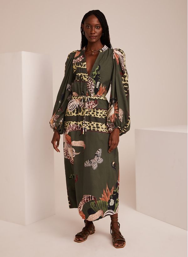 O Chemise é confeccionado em tecido plano com estampa, possui modelagem reta, gola alta, decote V, mangas longas com volume bufante e elásticos nos punhos, cordão aplicado, bolsos nas laterais, comprimento midi e acabamento pespontado.